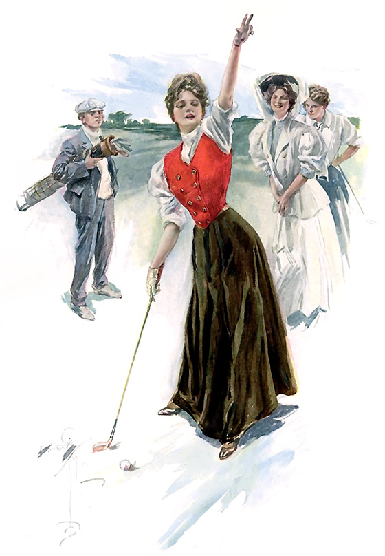 Harrison Fisher Fore - Prent van golf spelende vrouw. 1909. Golf zou altijd een sport blijven voor de elite, maar wel ook voor het vrouwelijke gedeelte daarvan.
