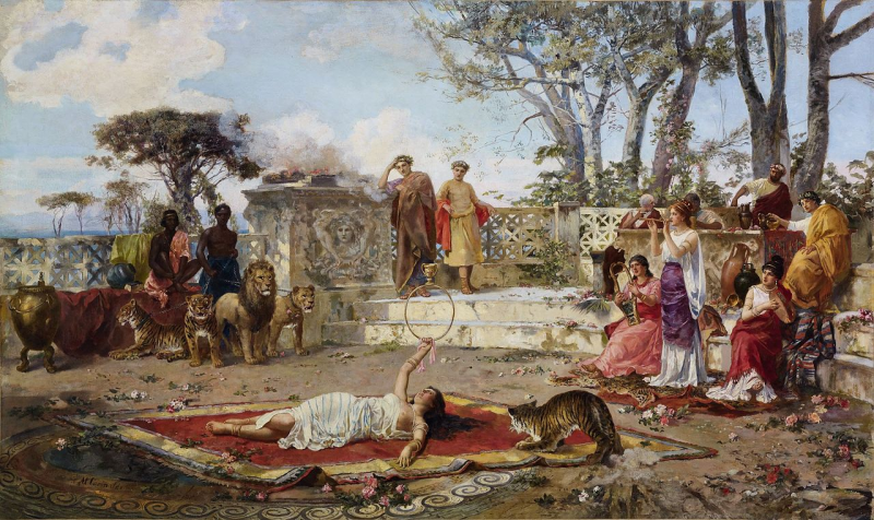M (?) Corinaldo - Antieke scène, +/- 1900. Een dompteuse vermaakt keizer Augustus en enkele hovelingen, waarschijnlijk op het eiland Capri nabij Napels, ook tegenwoordig nog een ultieme plek voor vakantie en recreatie.