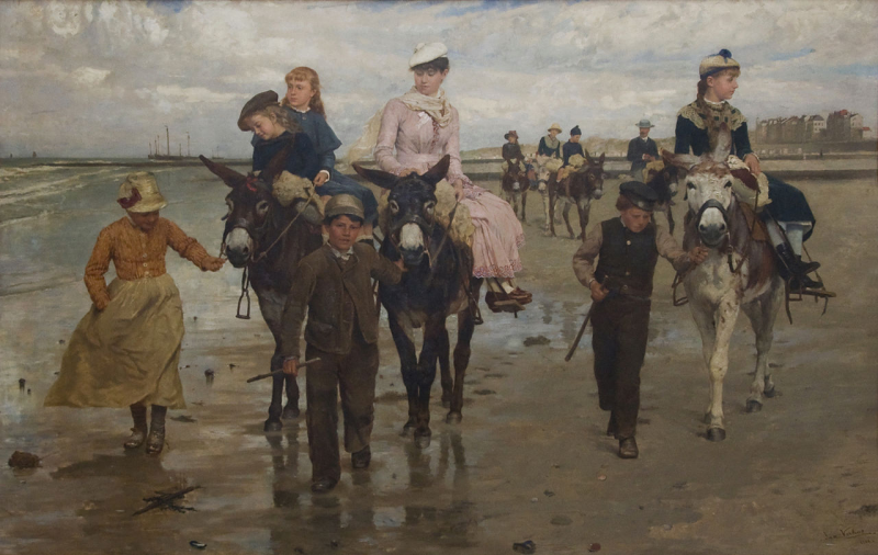 Jan Verhas - Ezelrit op het strand, 1884. (Ergens aan de Belgische kust.) Er was natuurlijk ook geld te verdienen in de nieuwe toeristische industrie, zoals voor de eenvoudige geklede kinderen hierboven die de ezels voeren waar evident welgestelde meisjes op zitten. De schilder laat het klassenverschil goed voelen, maar tegelijkertijd is het duidelijk dat deze kinderen slechter werk hadden kunnen hebben.