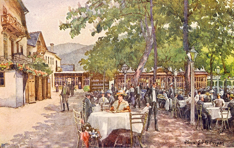 Hans Götzinger - Hotel "Alte Krainerhütte" in Helenental, 1911 (aquarel). Tegen 1911 was het idee van een terrasje pakken al helemaal ingeburgerd.