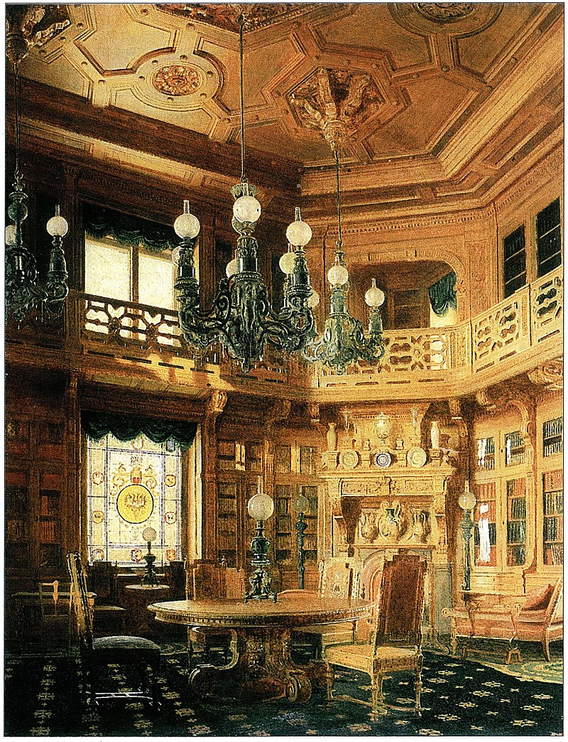 A.A. Brobov - Bibliotheek van het Anichkovpaleis, 1869. De absolute top qua verlichting van een ruimte in deze tijd: meerdere kunstige, speciaal ontworpen kroonluchters met olielampen plus bijpassende staande modellen.
