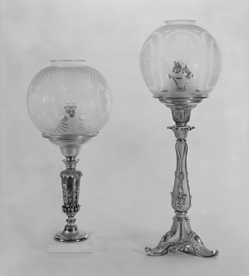 Twee astrale Argandlampen. Geretoucheerde bewerking van een foto uit 1860. Ontwerper van deze lampen is Henry N. Hooper.
