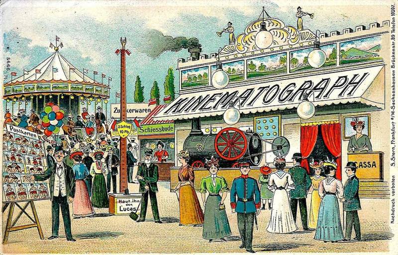 Duitse ansichtkaart van een jaarmarkt met een 'kinematograph', een rondreizende voorloper van de bioscoop. +/- 1900 (Bron:Wikimedia)