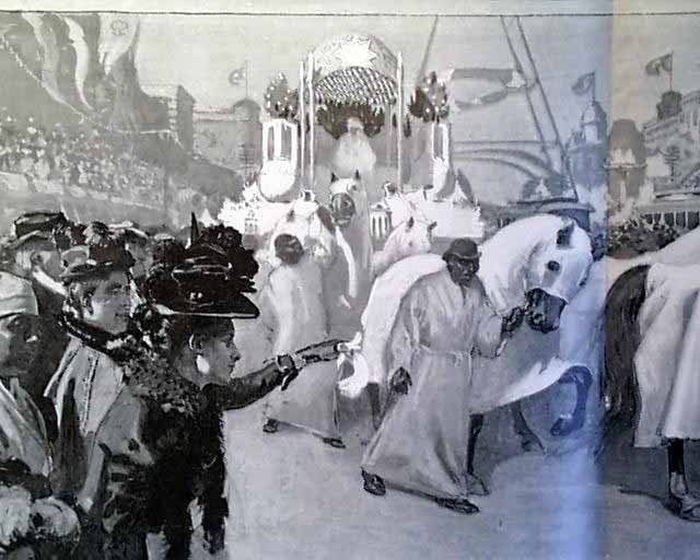 Mardi Gras in 1898. Door huisillustrator Harpers Weekly (Bron: Wikimedia/ Harpers Weekly 1898). Mensen kijken naar een carnavalsoptocht in Canal Street.