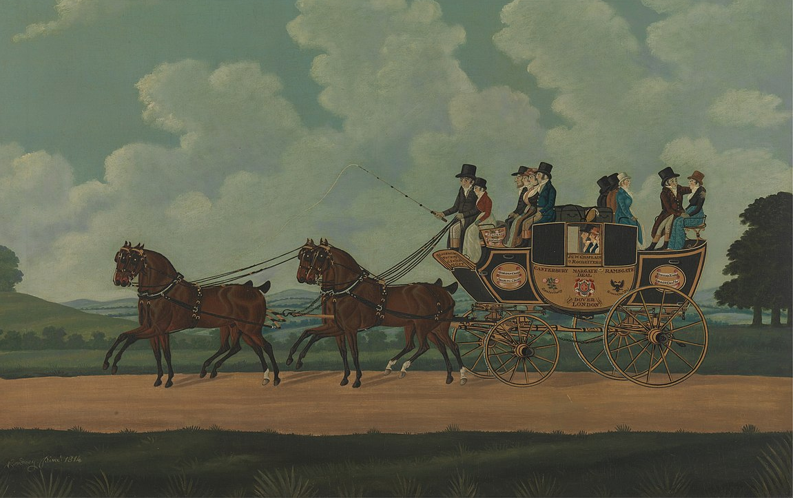 John Cordrey - J. & W. Chaplin's postkoets van Dover naar Londen onderweg, 1814 (cropped). Bron: Wikimedia Commons/ Yale Center for British Art