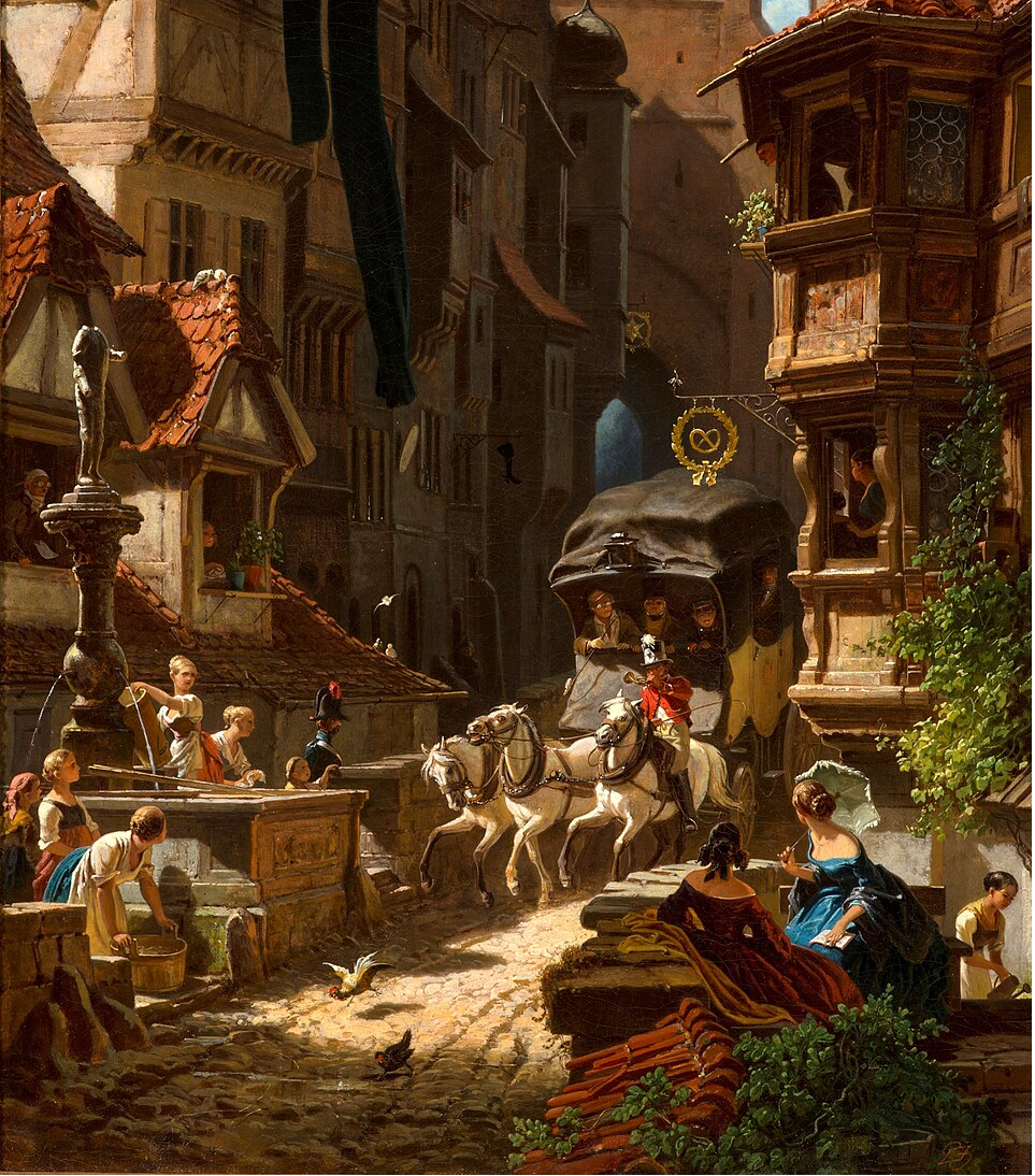 Drukte bij een lokale stopplaats voor postkoetsen halverwege de 18de eeuw. Opvallend detail: er is een los trapje nodig om in te kunnen stappen. De afbeelding doet het ergste vermoeden voor het comfort van de reizigers.