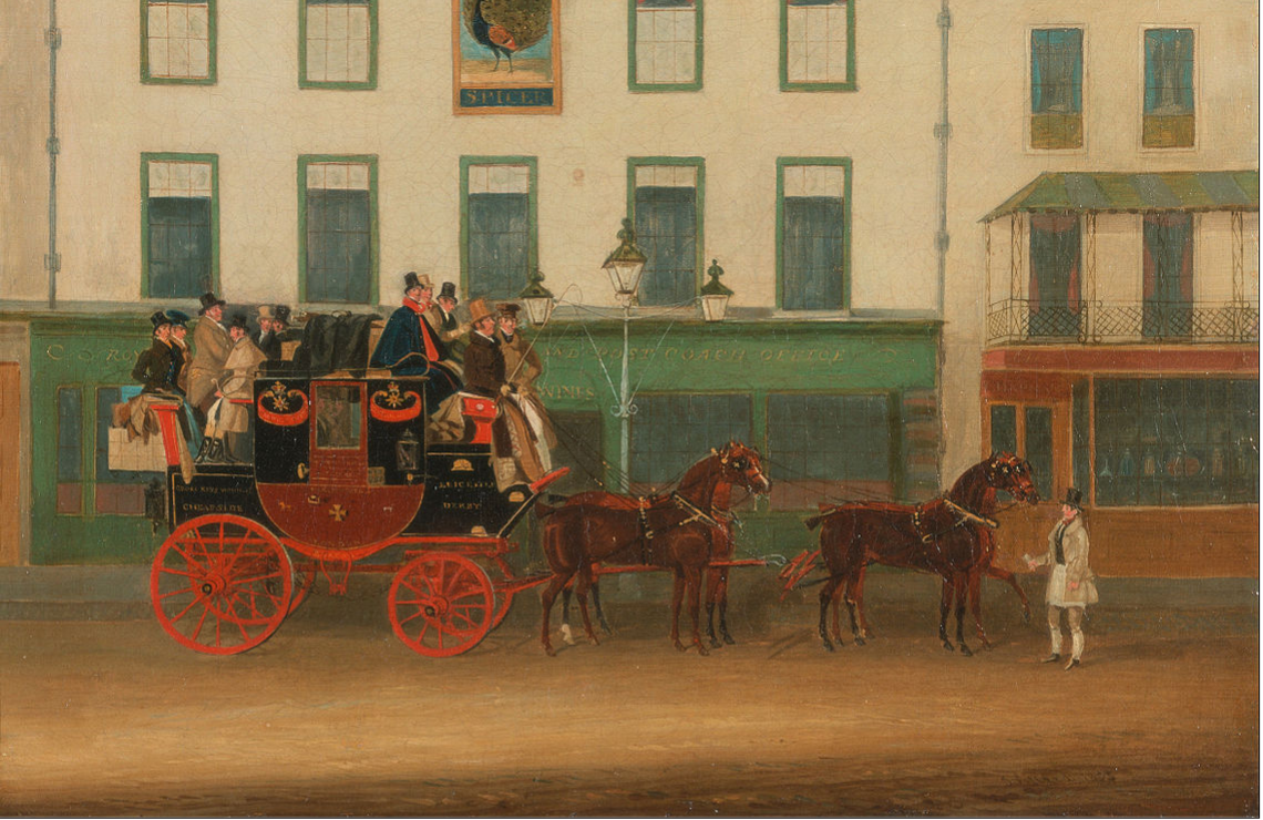 James Pollard - De postkoets Londen-Manchester, 'The Peveril of the Peak', bij de Peacock Inn in Islington, 1835 (cropped). Bron: Wikimedia Commons/ Yale Center for British Art