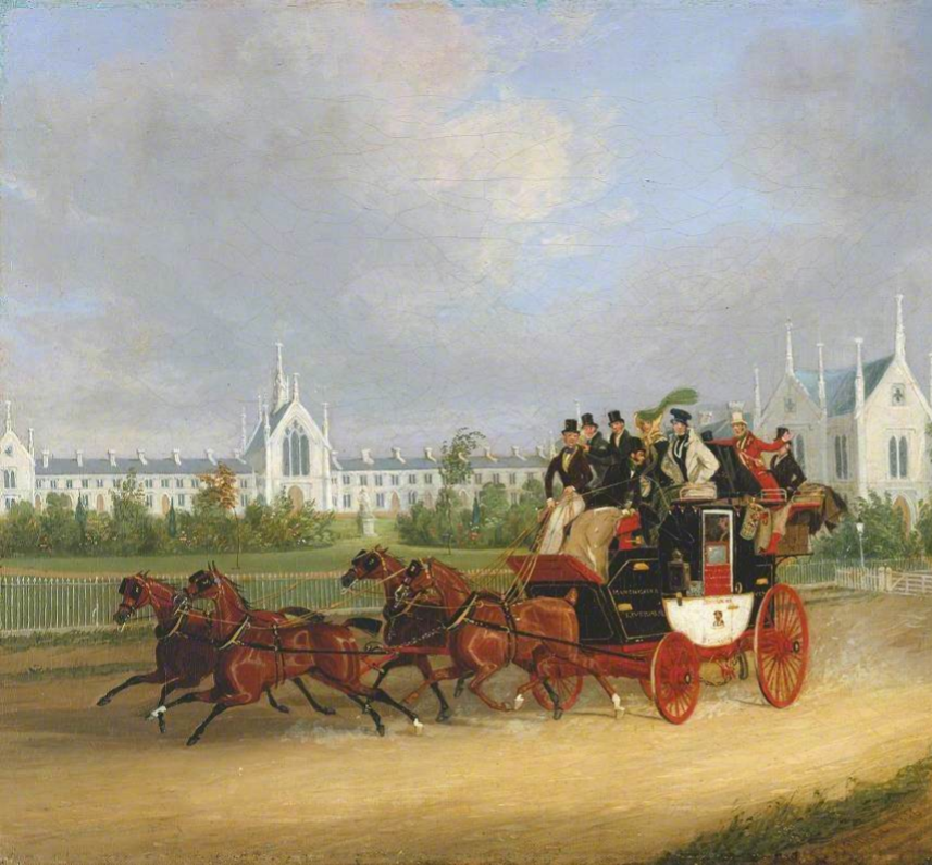 James Pollard - De Tally-ho stagecoach van de lijn Londen-Birmingham passeert Whittington College in Highgate, 1836. Bron: Wikimedia Commons/ Tate/ Art UK