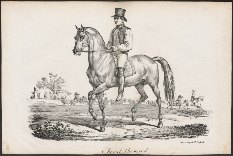 Carle Vernet en François-Séraphin Delpeche - Normandisch paard, tussen 1790-1825, print uit de langlopende serie Iconographia Zoologica (1700-1880). Bron: Wikimedia Commons/ Speciale collecties van de universiteit van Amsterdam
