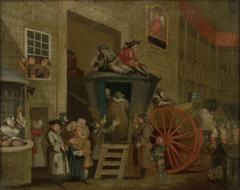William Hogarth - De postkoets, of de binnenplaats van een landelijke herberg, 1747. Bron: Wikimedia Commons/ Ashmolean Museum