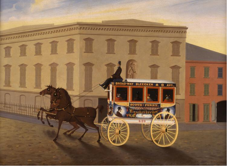 Maker onbekend - Knickerbocker Stage Line Omnibus, New York City, rond 1850 (cropped). Credit: New-York Historical Society. Op deze afbeelding is het goed te zien: een vrij wankel voertuig op houten wielen op een oneffen weg. De koetsier hoog op zijn bok heeft maar weinig controle over wat er gebeurt.