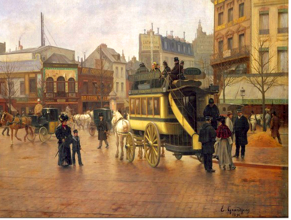 Edmund Grandjean - Place Clichy, 1896 (cropped). Dubbeldekker omnibus in Parijs met zowel de trap als het betere wegdek goed zichtbaar.
