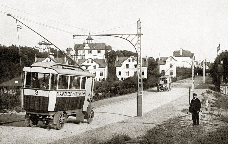 Trolleybussen van Schiemann & Co. op de lijn Blankenese-Mariënhohe, 1911-1914.
