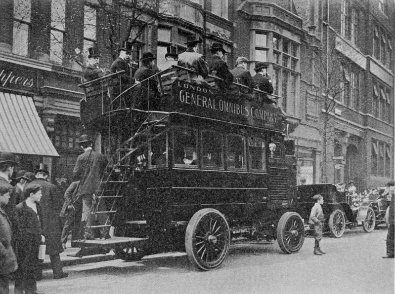 Overvolle dubbeldekker autobus in Londen van de General Omnibus Compagny in 1903. Hoe kon Londen ooit hebben bestaan zonder?