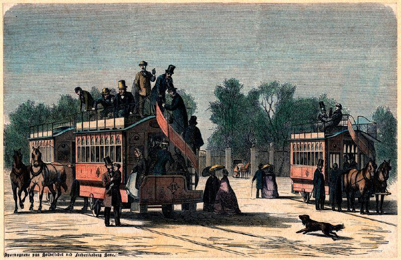 Maker onbekend - Paardentrams in Kopenhagen, 1865. Het verschil met dubbeldekker omnibussen zit inderdaad vooral in de rails.