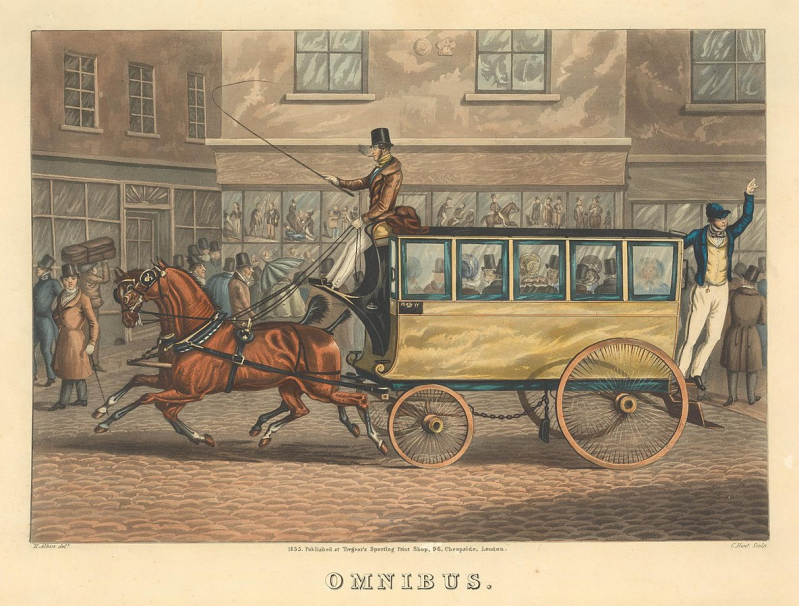 De eerste Londense omnibus van George Shillibeer, maker onbekend. Deze afbeelding uit: Henry Charles Moore - Omnibuses and cabs, 1902, gebaseerd op een afbeelding uit 1829.