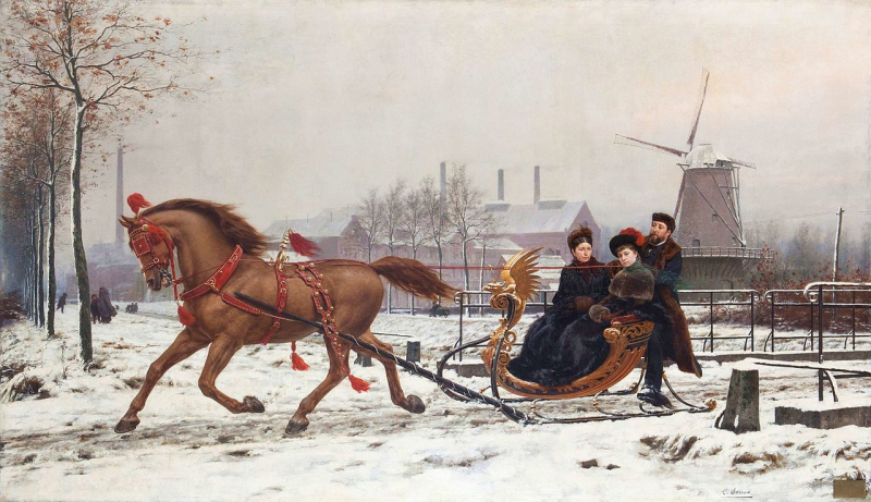 Karel Ooms - Aristocratische familie geniet van het winterlandschap, 1885. Belgische adel rijdt in een prachtig versierde slee die geïnspireerd lijkt op de cutter. De bellen op het tuig van het paard zijn goed te zien.