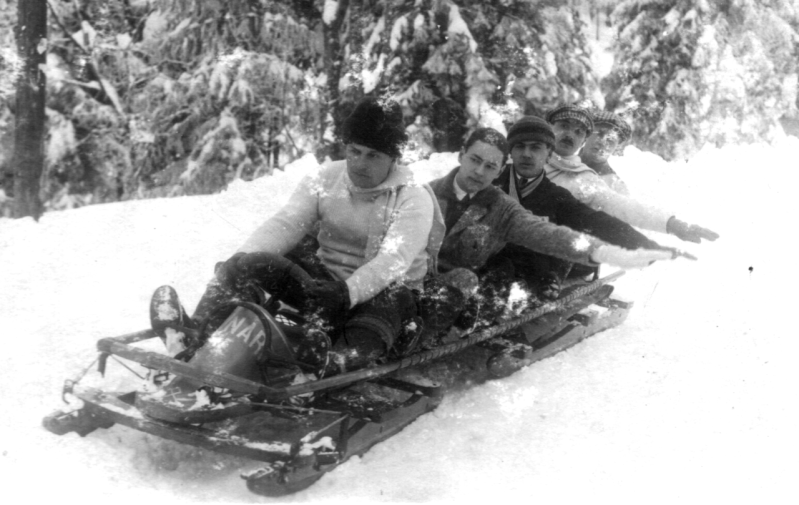 Een bobslee uit 1914 bij een wedstrijd in Roemenië. De besturing en de twee afzonderlijke delen van het onderstel zijn goed zichtbaar. Aanvankelijk was vijf personen een normale hoeveelheid passagiers voor een bobslee.