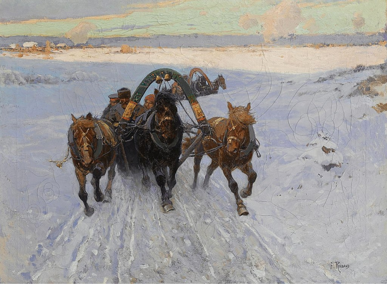 Franz Roubaud - Trojka racet door de sneeuw, datum onbekend (1876-1928). Schilderij met duga en Orlov-dravers vol in beeld. Let ook op de bellen boven in de duga.