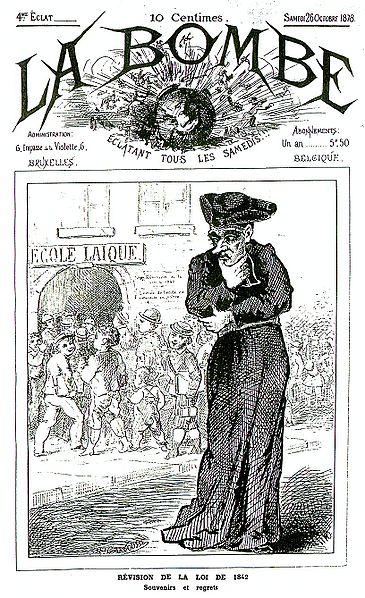 Omslag van het Belgische satirische tijdschrift La Bombe uit 1878. Het is een spotprent over de eerste Belgische schoolstrijd die in 1878 ontstond door de wijziging van een wet uit 1842, waarbij een liberale regering katholieke geestelijken hun voorrechten binnen het Belgische basisonderwijs ontnam. Dergelijk schoolstrijden komen alleen binnen verzuilde samenlevingen voor. Nederland heeft er een gehad, België had er twee.