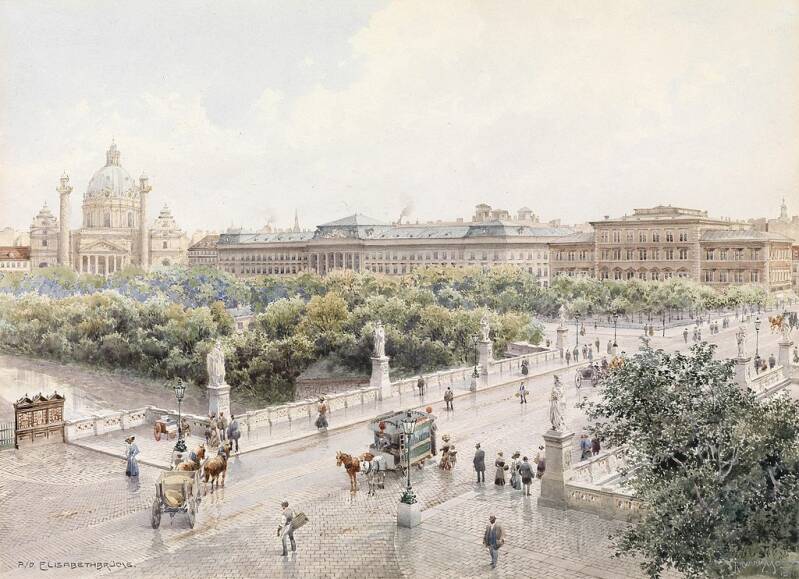 Richard Moser - Elisabethbrücke, Karlskirche en Technische Universieit in Wenen. 1911 Het aangezicht van de nieuwe grootstad met brede boulevards en kolossale gebouwen.