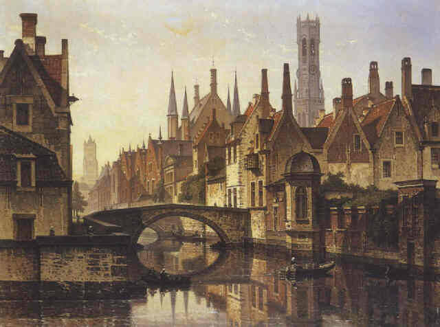 François Stroobant - Zicht op Brugge. 1880 Op deze afbeelding is goed te zien hoe dicht bebouwd het rustieke Brugge wel niet was.