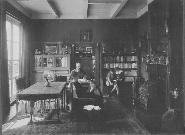 Jac. van den Bosch met zijn gezin in villa Zorgvlied te Bloemendaal rond 1910. Ingericht conform de binnenhuisstijl.