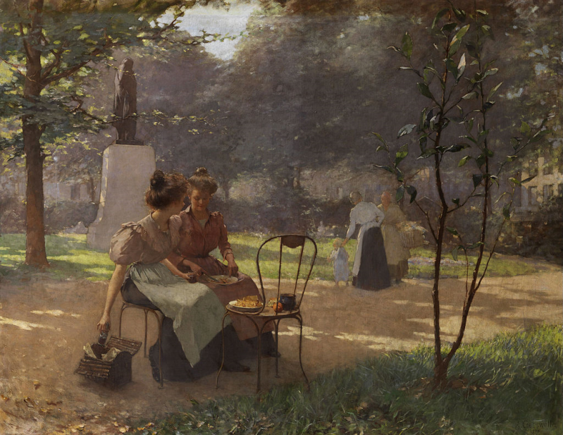 Albert Cresswell - Twee jonge meisjes in het park, 1903. Twee dienstmeisjes gebruiken hun middaglunch in het park, vermoedelijk ergens in Parijs.