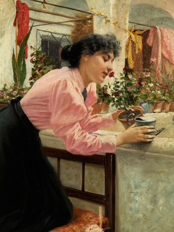 Louis Uhl - Jonge vrouw geeft planten water, 1896. In een stadse omgeving moest je creatief zijn met het vinden van plek voor je planten.