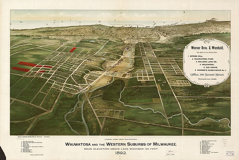 Marr & Richards Engraving Co. - Wauwatosa and te Western Suburbs of Milwaukee, 1892. In de razendsnel urbaniserende Verenigde Staten was het idee van de buitenwijk eerder geboren dan bij ons.