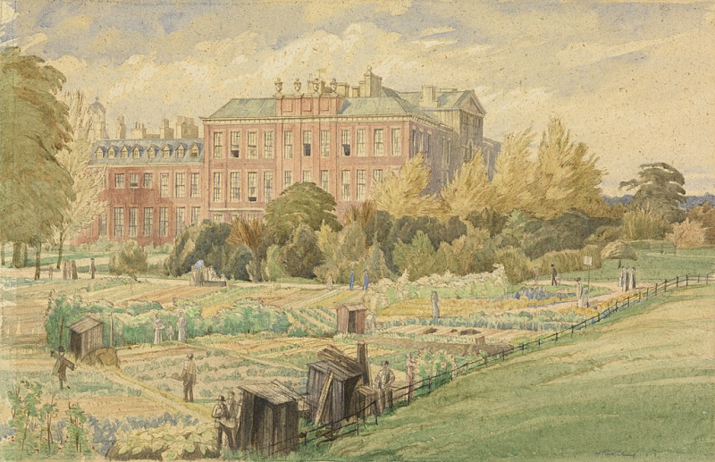 Henry Rushbury - Kensington Palace en moestuinen, 1914-1918. Deze moes- of volkstuinen waren tijdens de Eerste Wereldoorlog op het grondgebied van Kensington Palace opgericht om wat extra soelaas te bieden. Tijdens de Tweede Wereldoorlog zou dit opnieuw gebeuren.