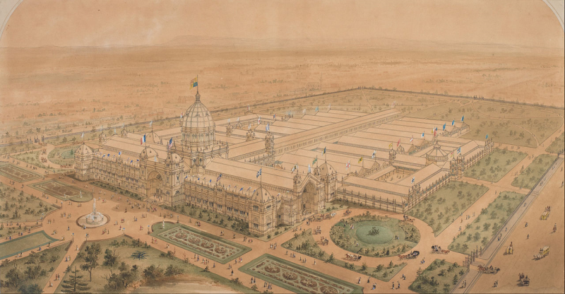Joseph Reed - Exhibition Building Melbourne 1880, from the South East Showing the Main Hall, 1879. Centraal gebouw van de wereldtentoonstelling van Melbourne in 1880. Dit gebouw staat er nog steeds.