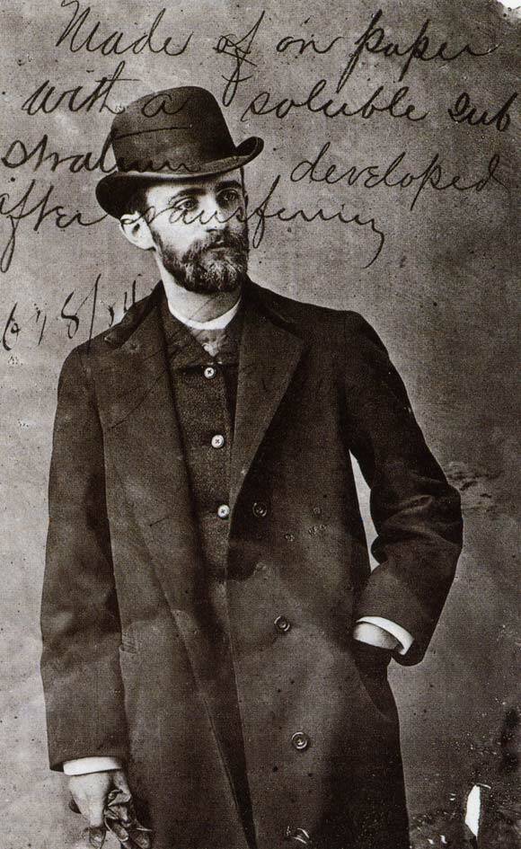 Links: Foto van George Eastman uit 1884, inclusief technische aantekeningen over hoe deze foto is gemaakt op met emulsie (soluble) bewerkt papier.