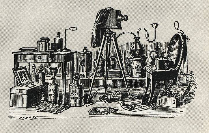 Camera-uitrusting van een Zweedse portretfotograaf rond 1850. Dat er bij fotografie veel scheikunde kwam kijken is duidelijk.
