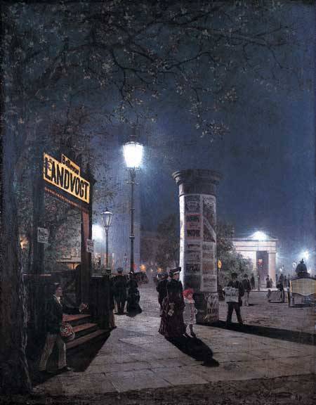 Carl Saltzmann - Eerste elektrische straatverlichting in Berlijn. 1884 Voor zover er in de 19de eeuw elektrische verlichting werd gebruikt, betrof dat meestal buitenverlichting of verlichting voor grote hallen die op een generator konden werken. Deze lamp is een booglamp.