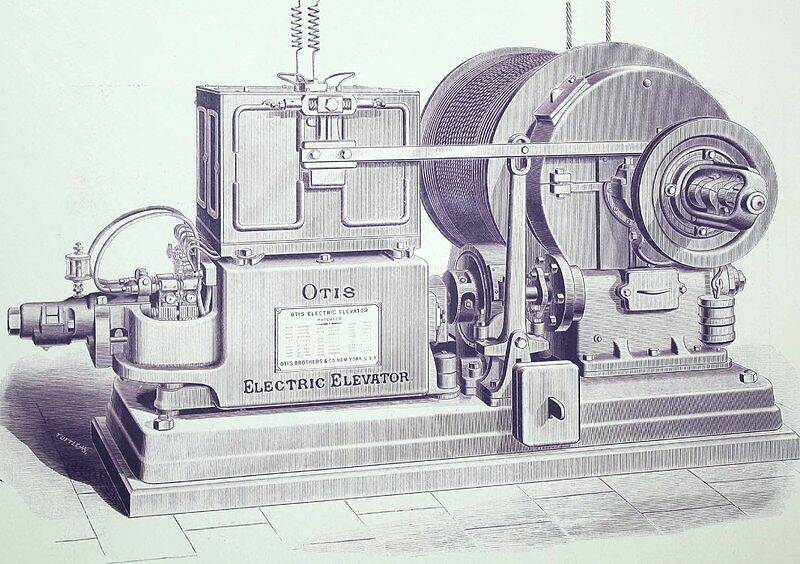 Elektrische motor van een lift uit de catalogus Hydraulic, electric, steam and belt elevators van Otis uit 1893.