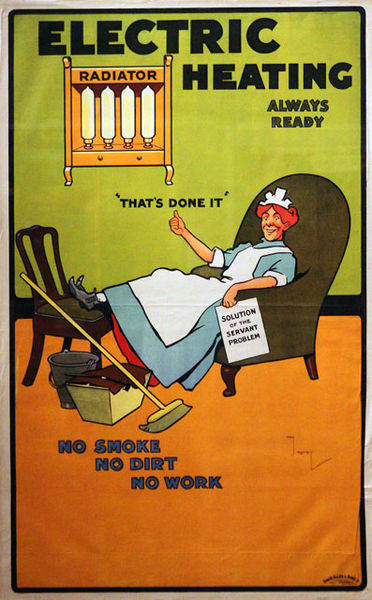 Reclameposter voor elektrische verwarming van rond 1900. Deze gaf totaal geen rommel, zoals de stookkachels die men indertijd meestal had in hoge mate wel deden, en was daarmee een verademing voor dienstmeisjes.