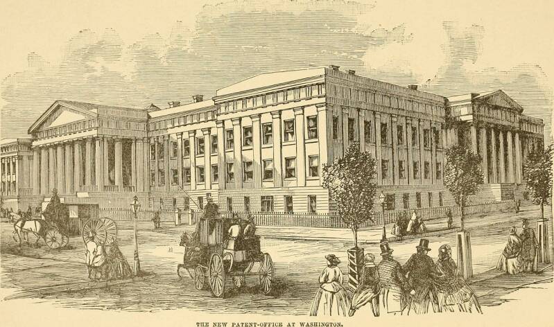 John Clark Ridpath - Het Amerikaanse Octrooibureau in Washington op een gravure uit 1893. Vele jarenlang was dit the place to be voor Amerikaanse uitvinders. Het gebouw staat er nog steeds, maar is tegenwoordig een museum.