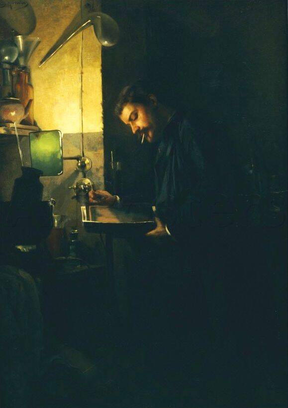 Louis Muraton - De fotograaf, 1901. Een fotograaf aan het werk in zijn donkere kamer; ook hij moest van alle markten thuis zijn.