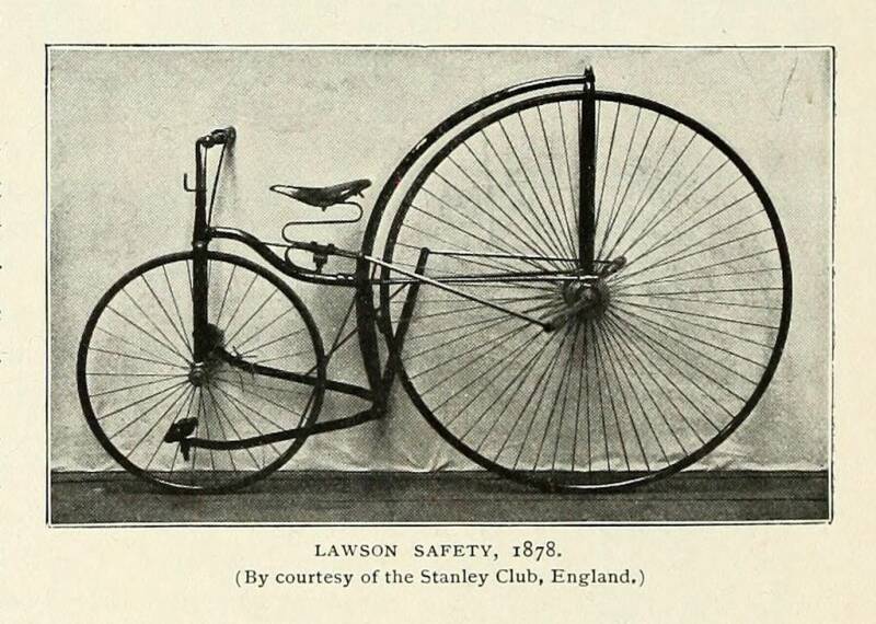Lawsonfiets met achterwielaandrijving uit 1878. Foto uit 1898/99.