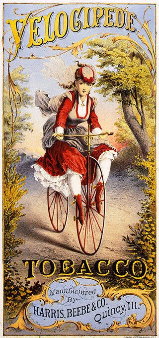 Afbeelding van een sigarenlabel uit 1874. Het toont een meisje (herkenbaar aan de korte rokken) dat op een vélocipède voor kinderen zit. Volwassen vrouwen konden het wel vergeten met de grote vélocipède. Die trapte veel te zwaar en bovendien was het niet te doen met al die grondlange rokken die ze verplicht waren te dragen.