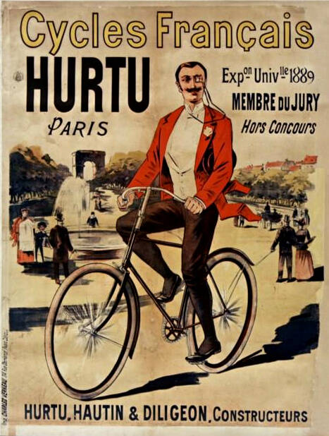 Affiche voor het Franse fietsmerk Hurtu uit 1889. Toont een tamelijk basale Rover safety.
