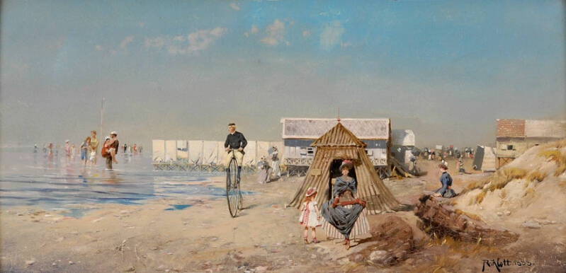 Robert Alott - Op het strand van Oostende. 1888. De fietser kijkt alsof het hem geen enkele moeite kost om met een hoge bi over een strand te rijden. Dat was echter niet bepaald een sinecure.