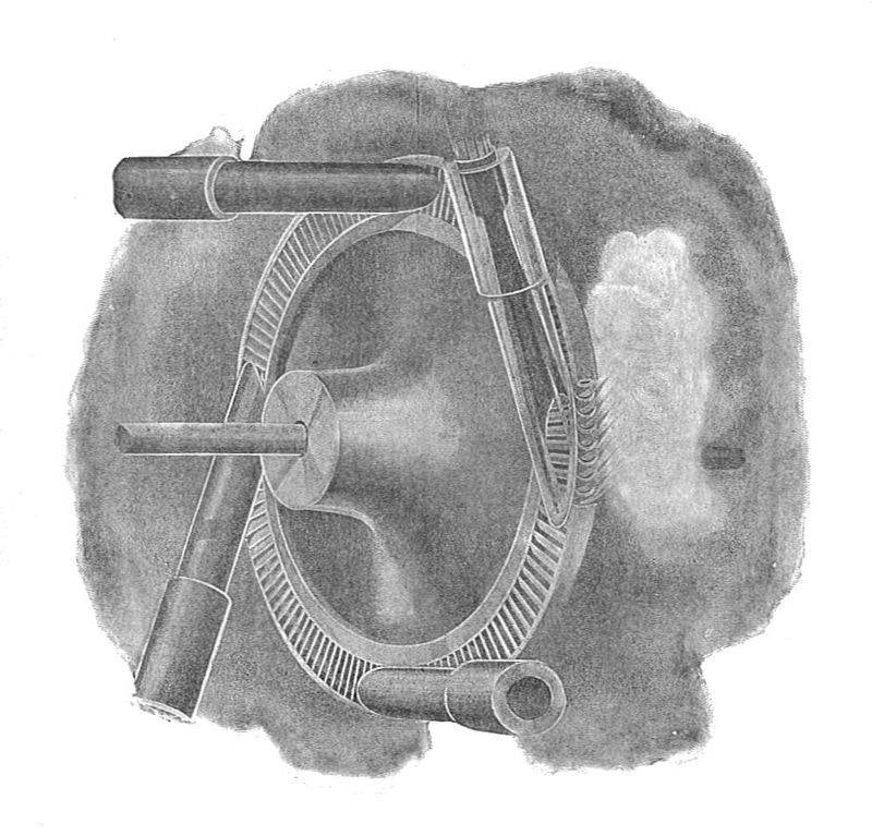 Rechtsboven: de schoepenraderen van de reactieturbine. +/- 1900