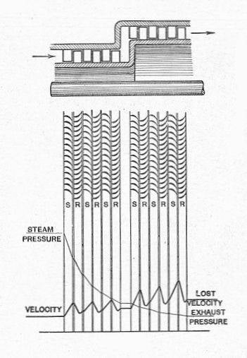 Links: Een diagram van de omzetting van druk naar snelheid in de zogeheten curtis-rateau turbine. 1913
